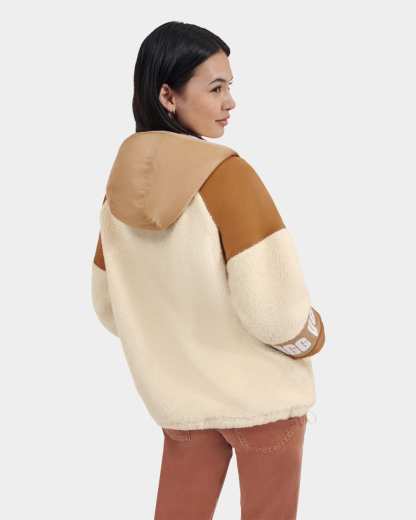 The sporty and stylish Carrabella UGGfluff jacket makes a bold statement with its mixed-material color-block aesthetic. The main body is crafted with blocks of UGGfluff plush fleece, sweatshirt-fleece material, and nylon for a textured look. Our graphic font logo borders the cuffs on each sleeve for a fun look.