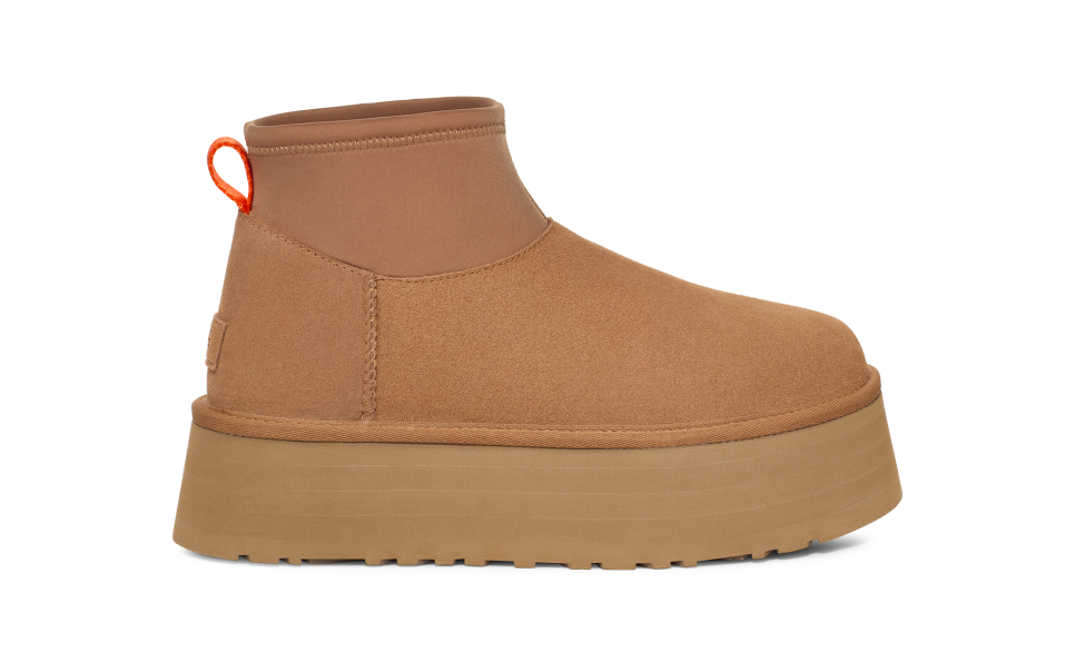 - Suede heel counter, Reversible leg warmer shaft, Rear pull tab made from 100% recycled polyester fibers, Suede vamp, Neoprene shaft