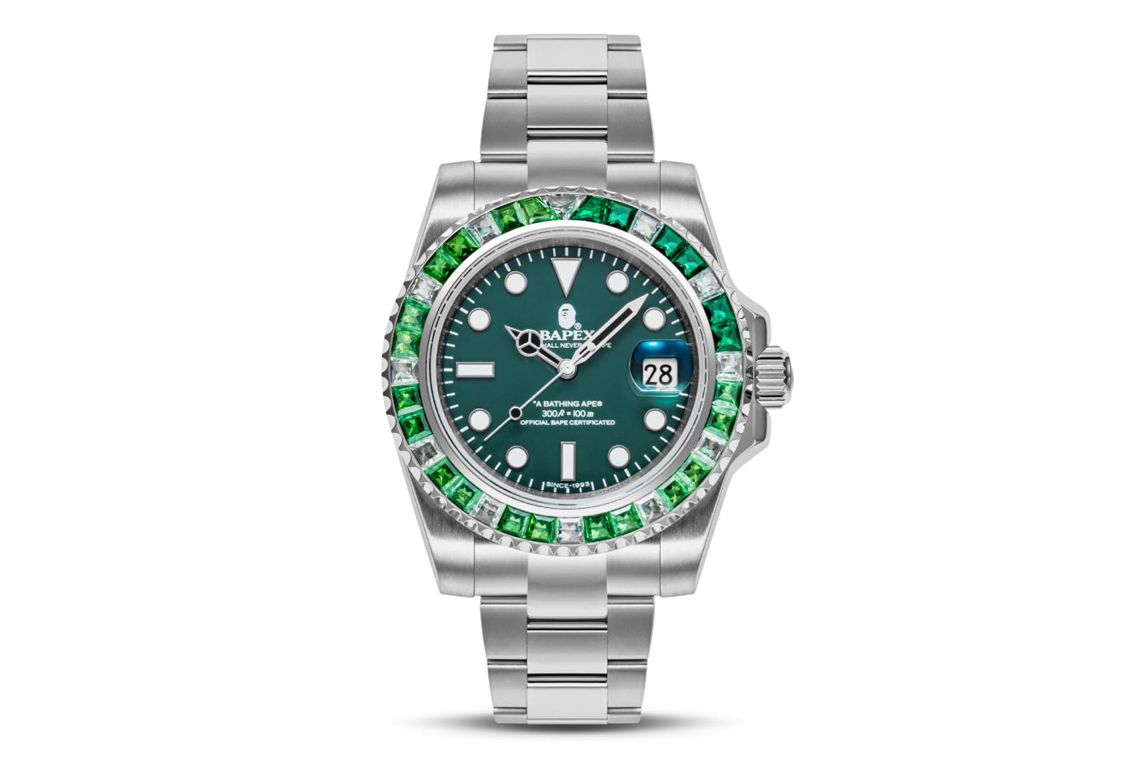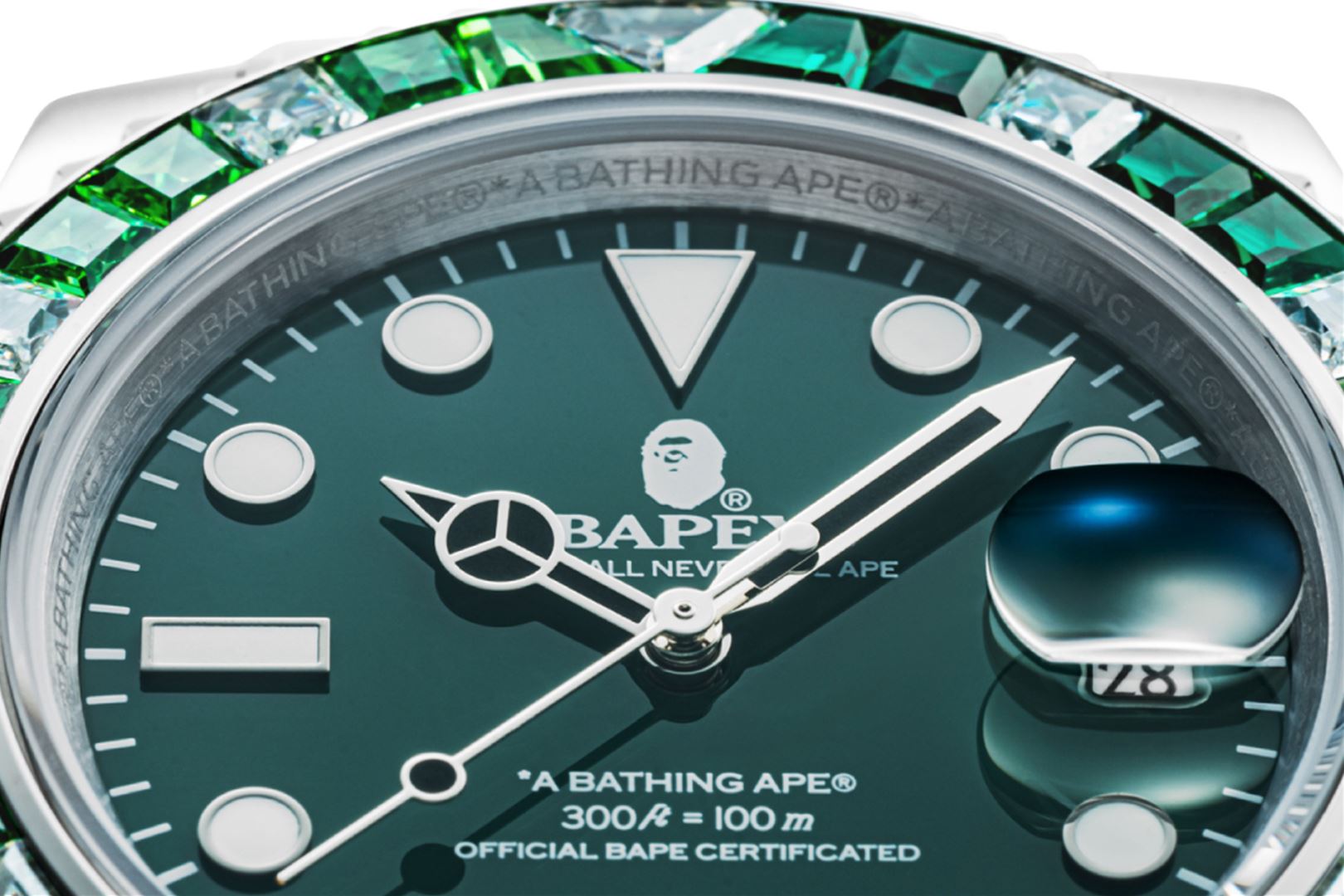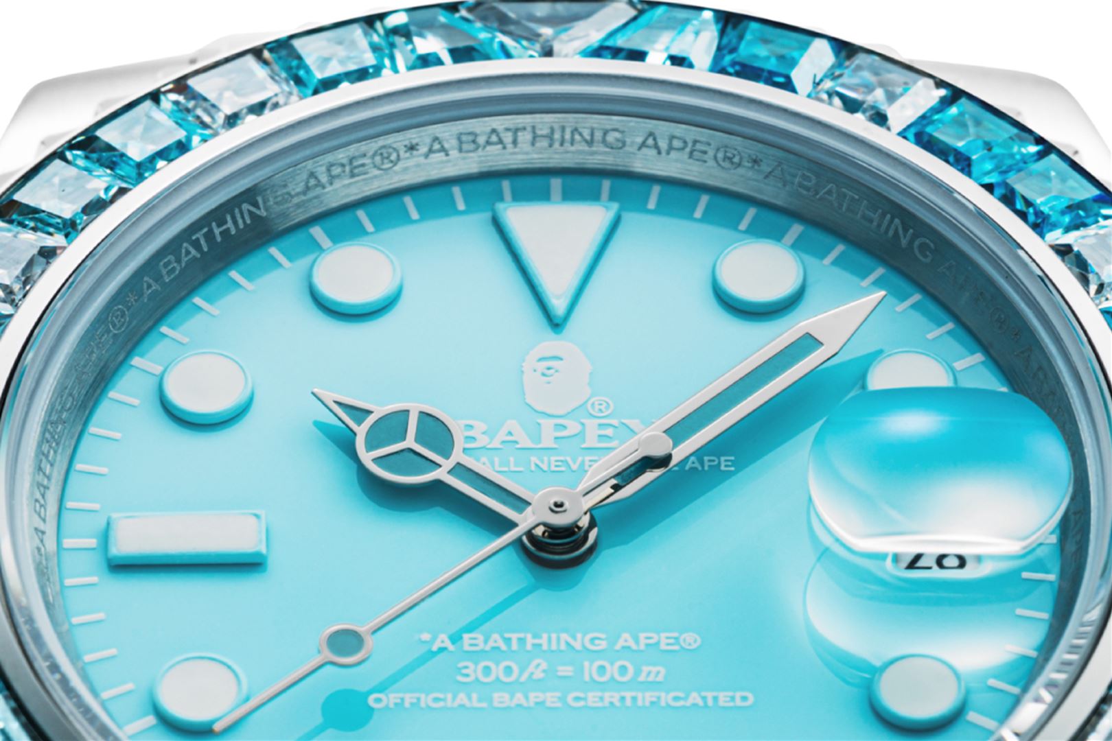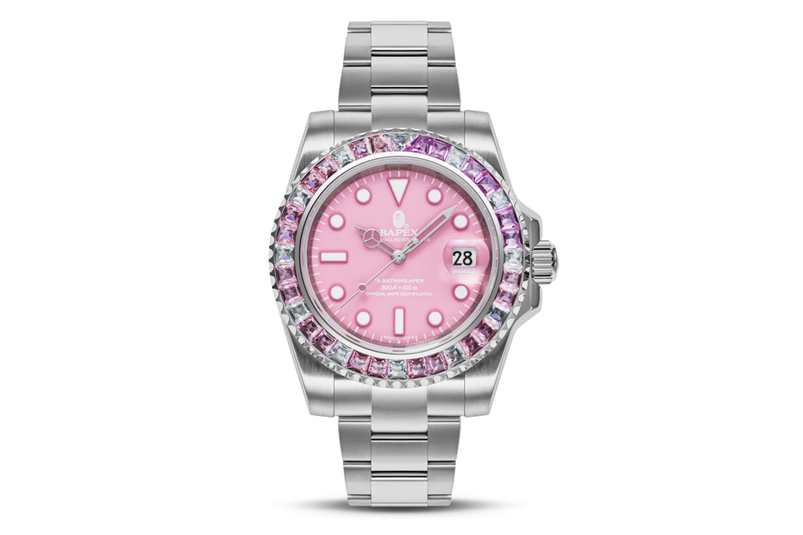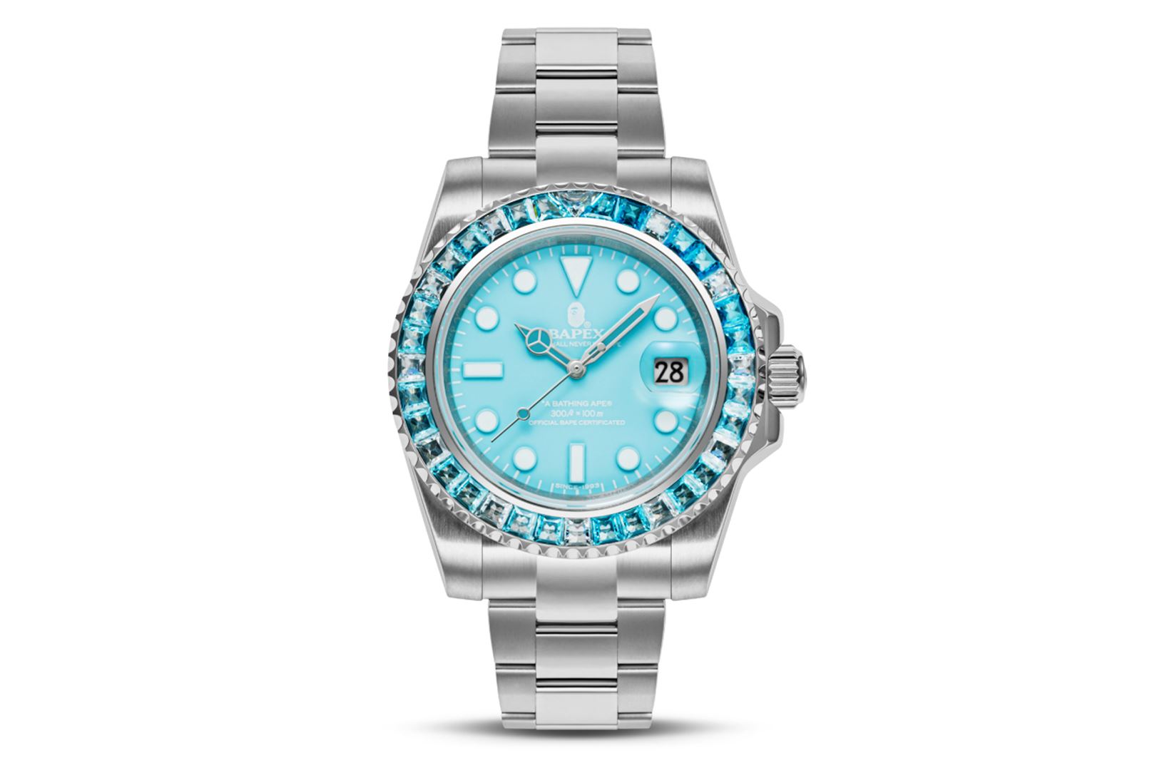 The TYPE 1 BAthtPEX CRYSTAL STONE watch is a stunning timepiece that features approximately 36 gemstones, adding a touch of luxury to the classic BAthtPE? design. The bezel is adorned with Cubic Zirconia stones, creating a dazzling effect that catches the eye. The watch has a 41mm dial and is water-resistant up to 100M, making it perfect for any adventure. It also boasts a power reserve of over 42 hours, ensuring that it keeps ticking even when you're not wearing it. The stainless-steel bracelet is both stylish and durable, while the scratch-resistant sapphire window protects the watch face from damage.?
