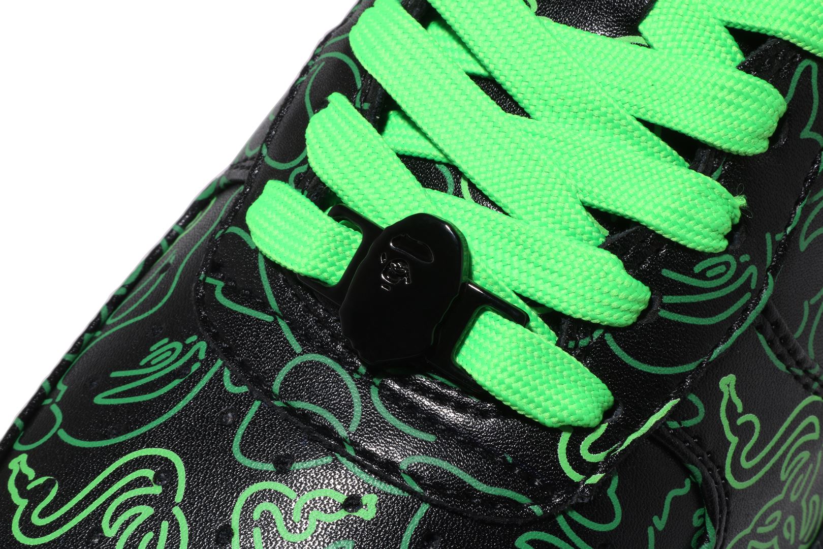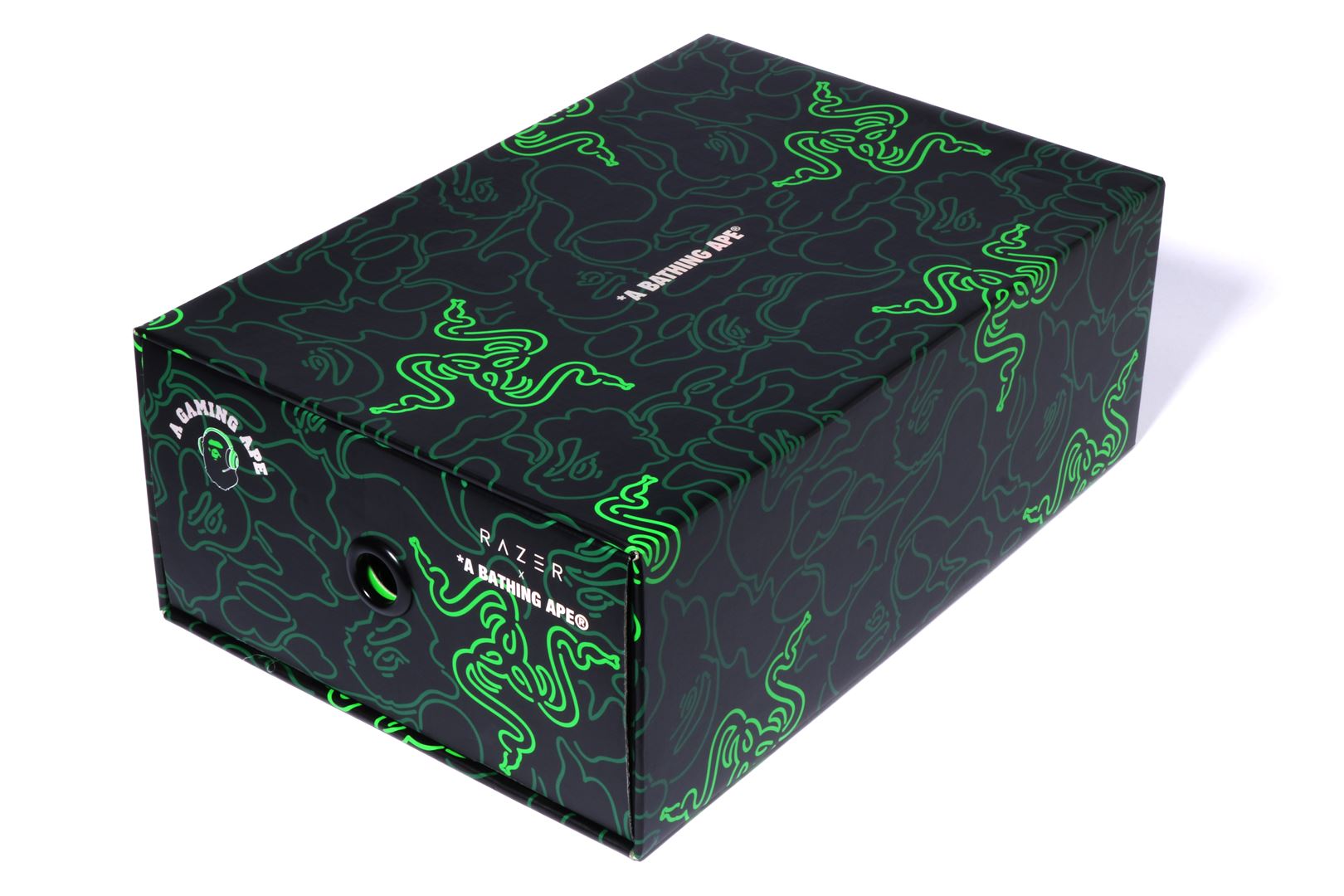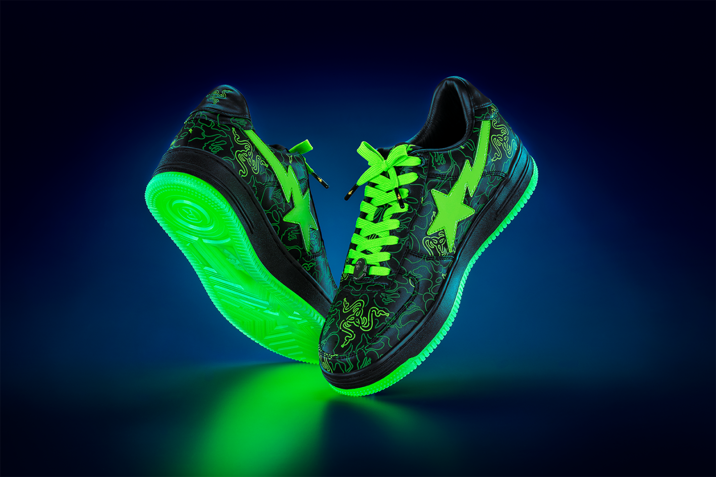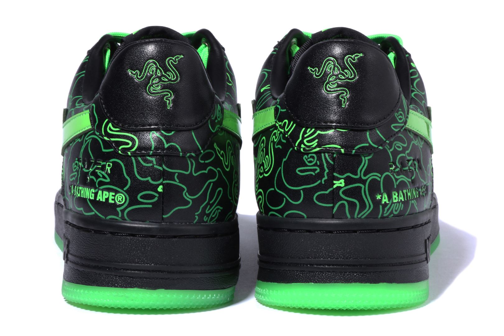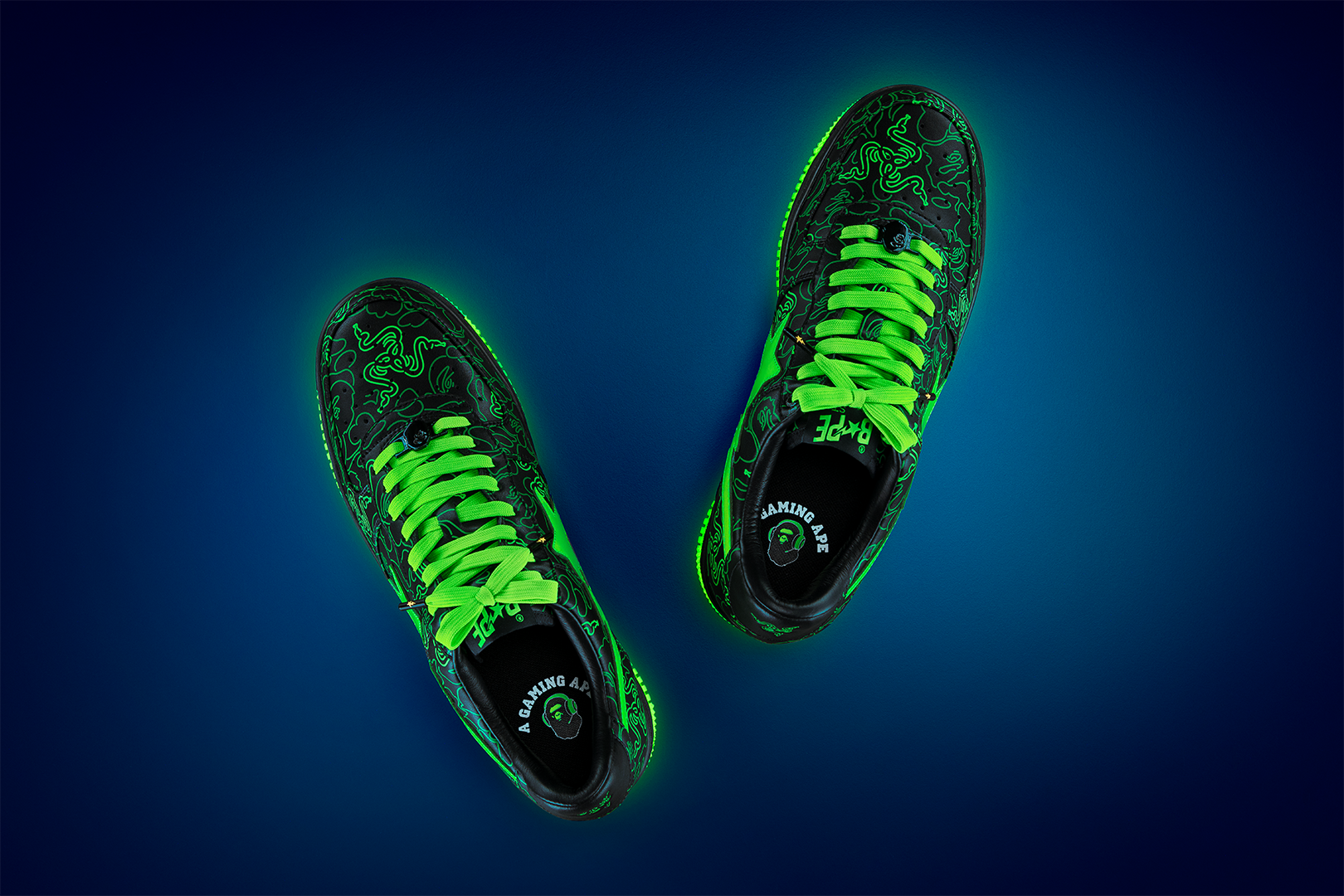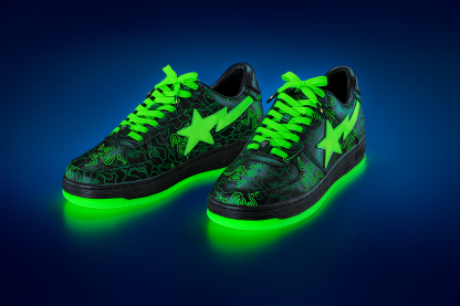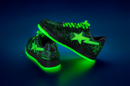 These sneakers feature BAthtPE®'s signature shark design on the soles and the BAthtPE STA? STA logo on the sides, adding style to the streets. In addition, it glows Razer green in the dark, illuminating the camo pattern that collaborates with BAthtPE? and Razer's triple-headed snake logo.
