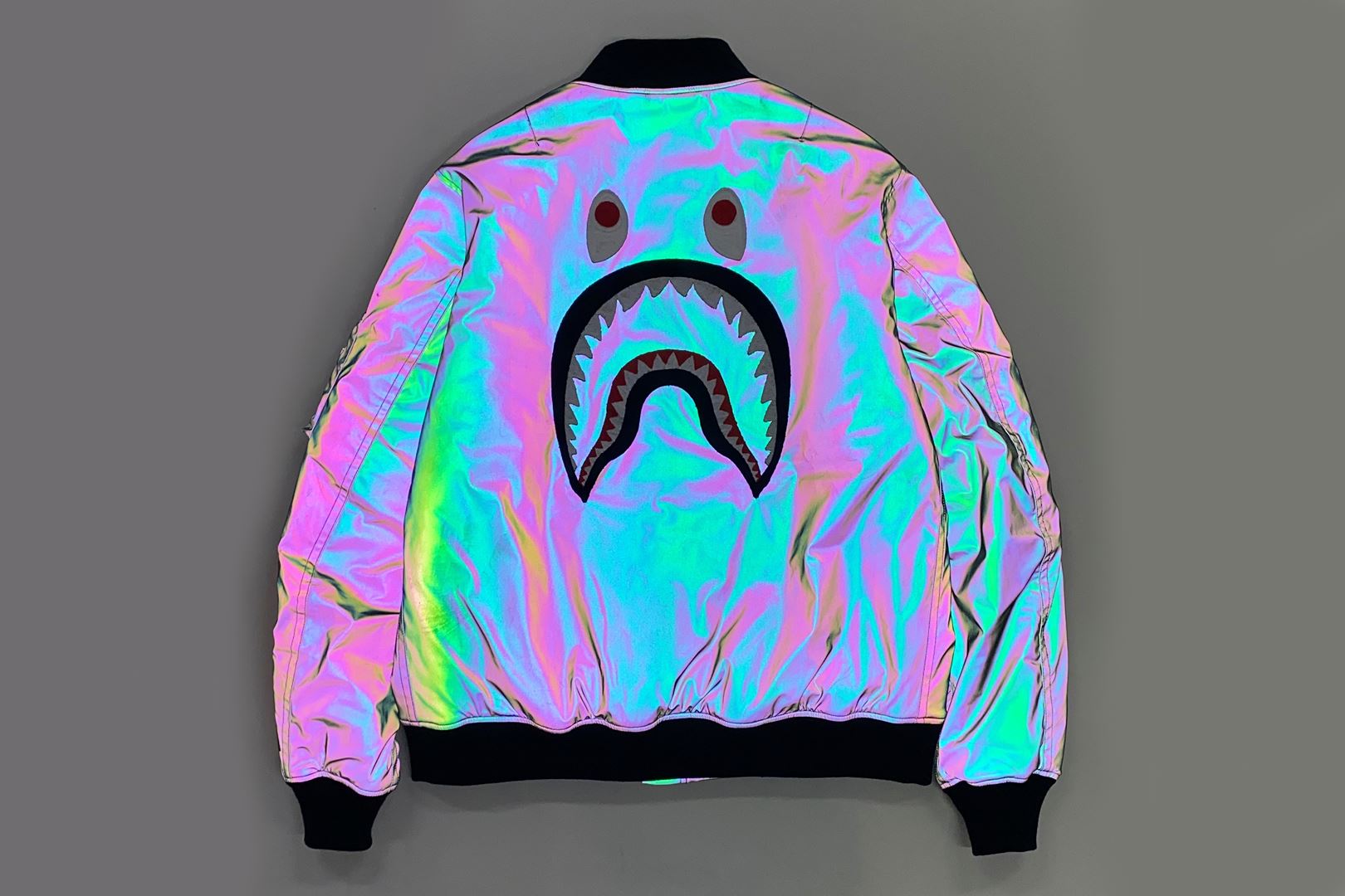 MA-1 made using retroreflective material. It features a SHARK motif and is sized for a loose fit.