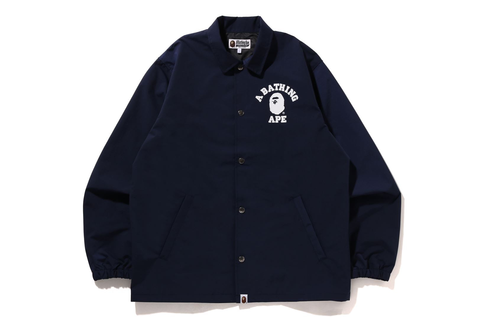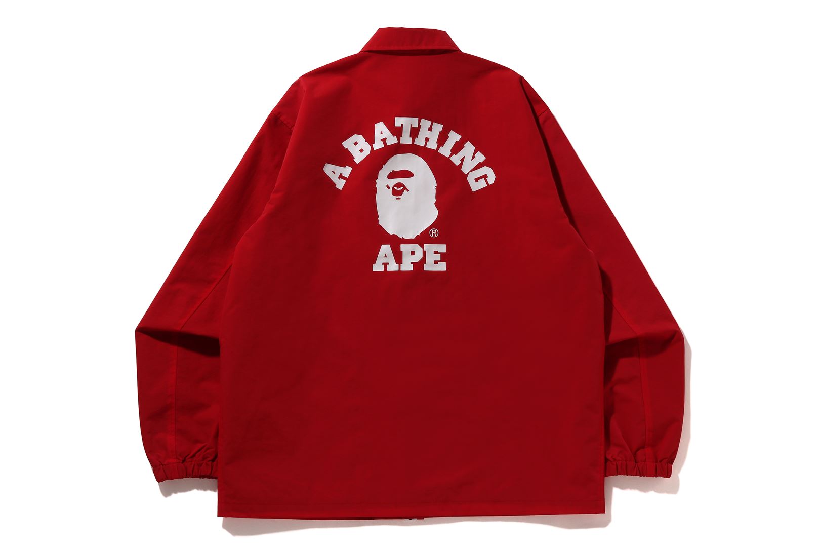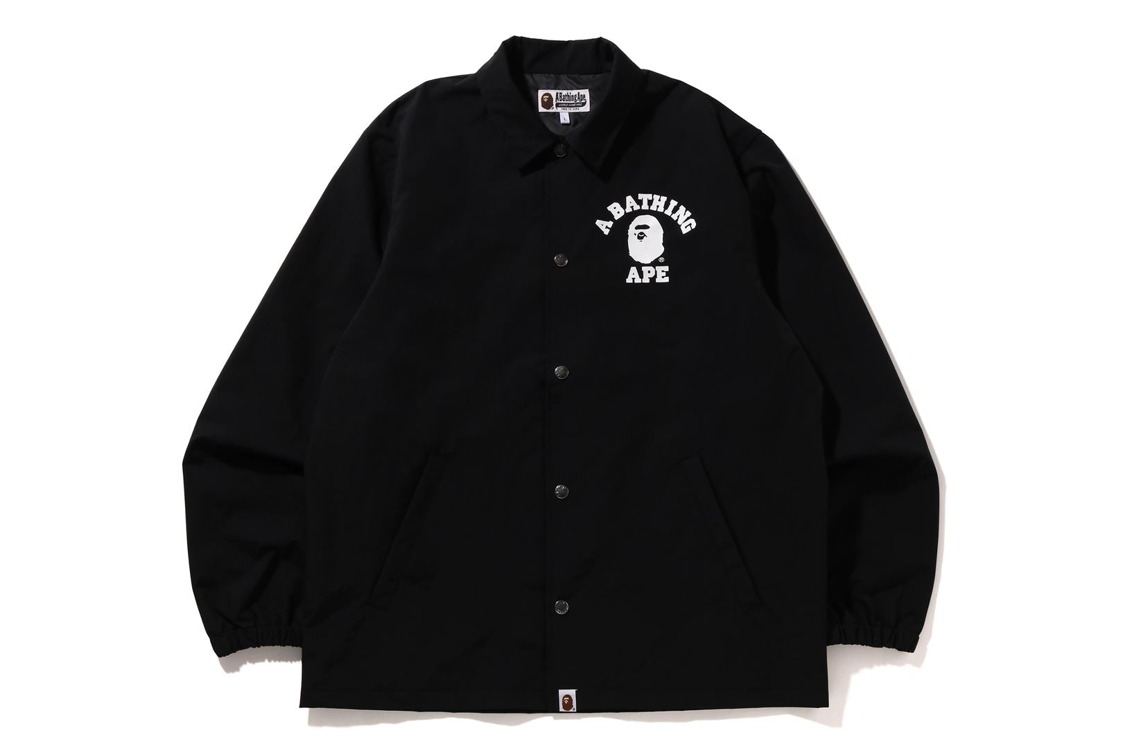 Coach jacket made of nylon material. APE HEAD and arched brand logo are rubber printed on the left chest and back. Slash pockets on both hips of the body, a piss name in the center of the hem, snap buttons on the front, and rubber ribbed cuffs. A silhouette with a relaxed fit. Available in 3 colors and 5 sizes.