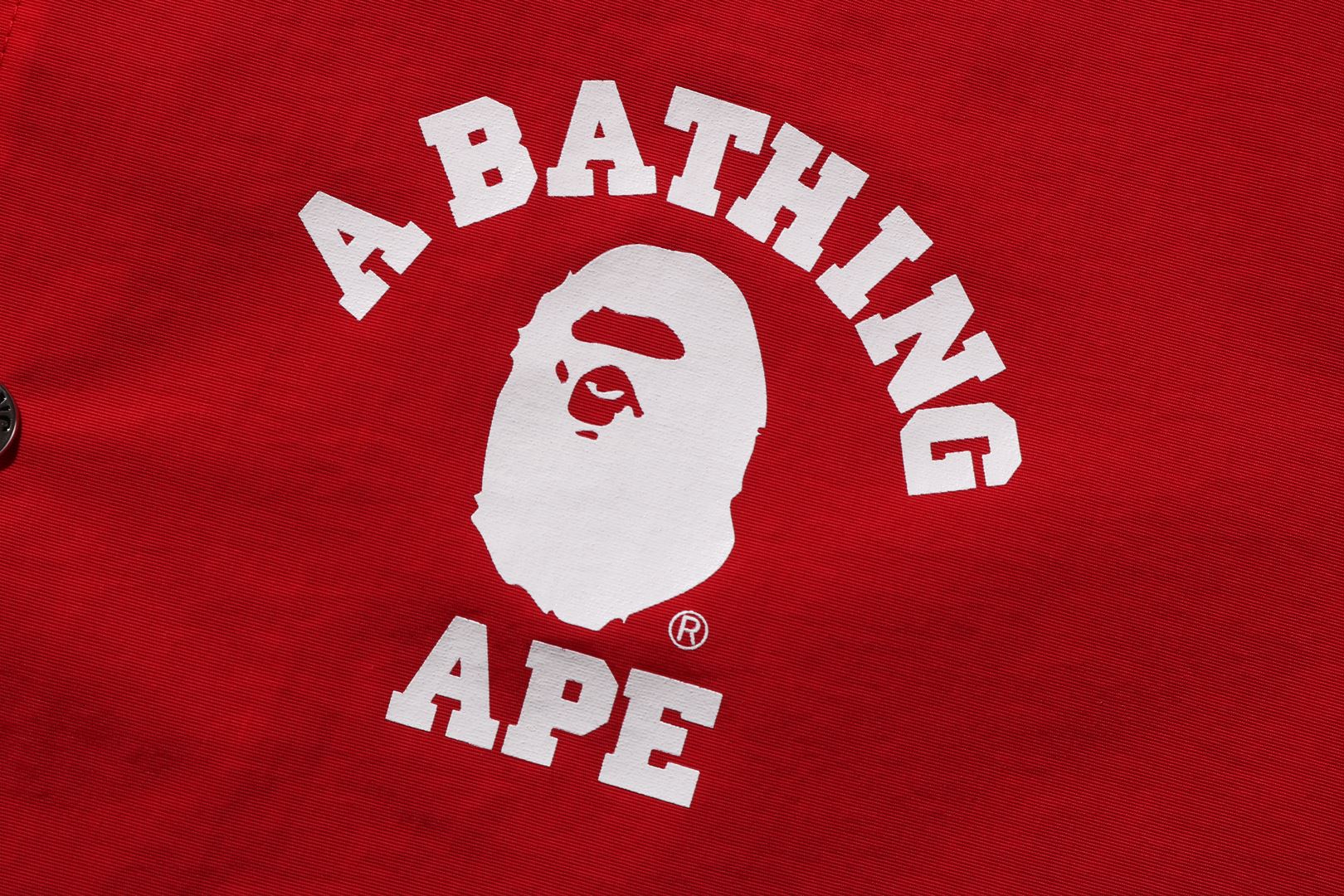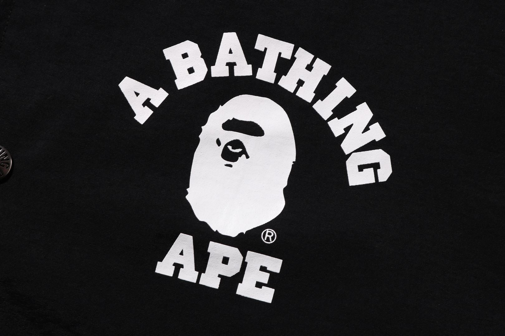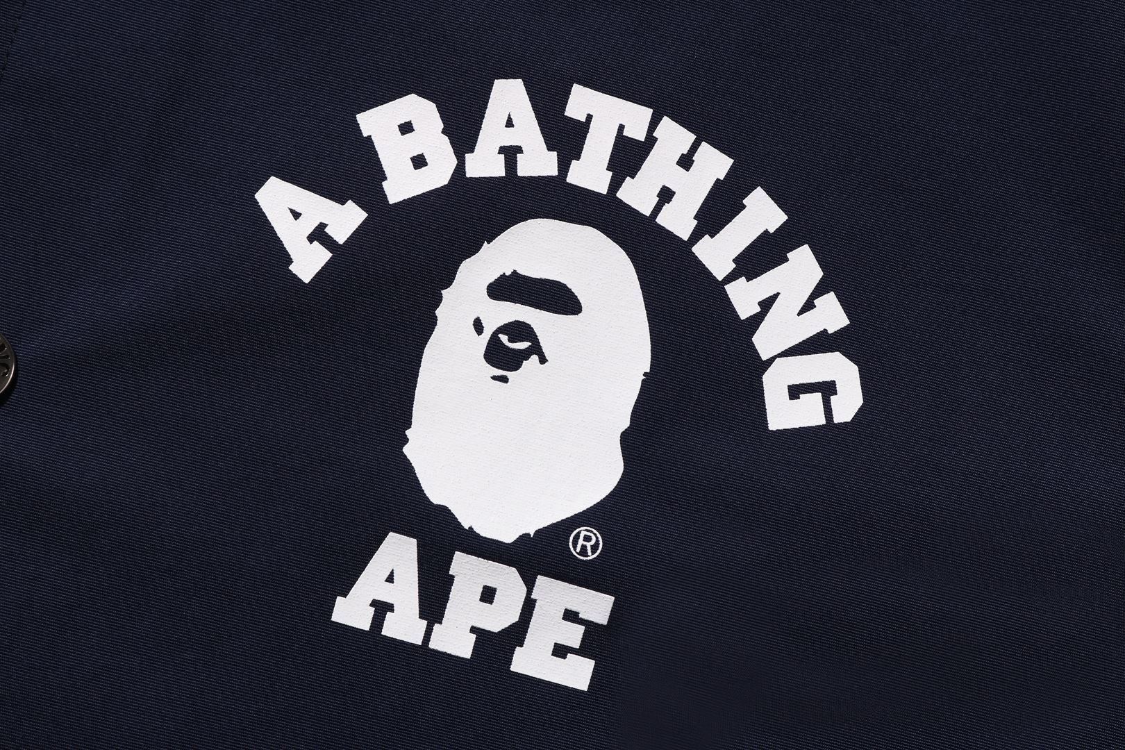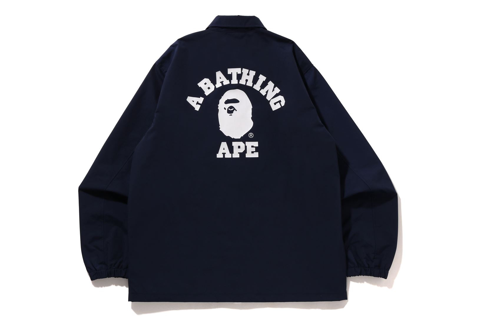 Coach jacket made of nylon material. APE HEAD and arched brand logo are rubber printed on the left chest and back. Slash pockets on both hips of the body, a piss name in the center of the hem, snap buttons on the front, and rubber ribbed cuffs. A silhouette with a relaxed fit. Available in 3 colors and 5 sizes.