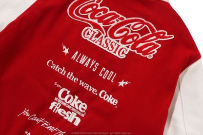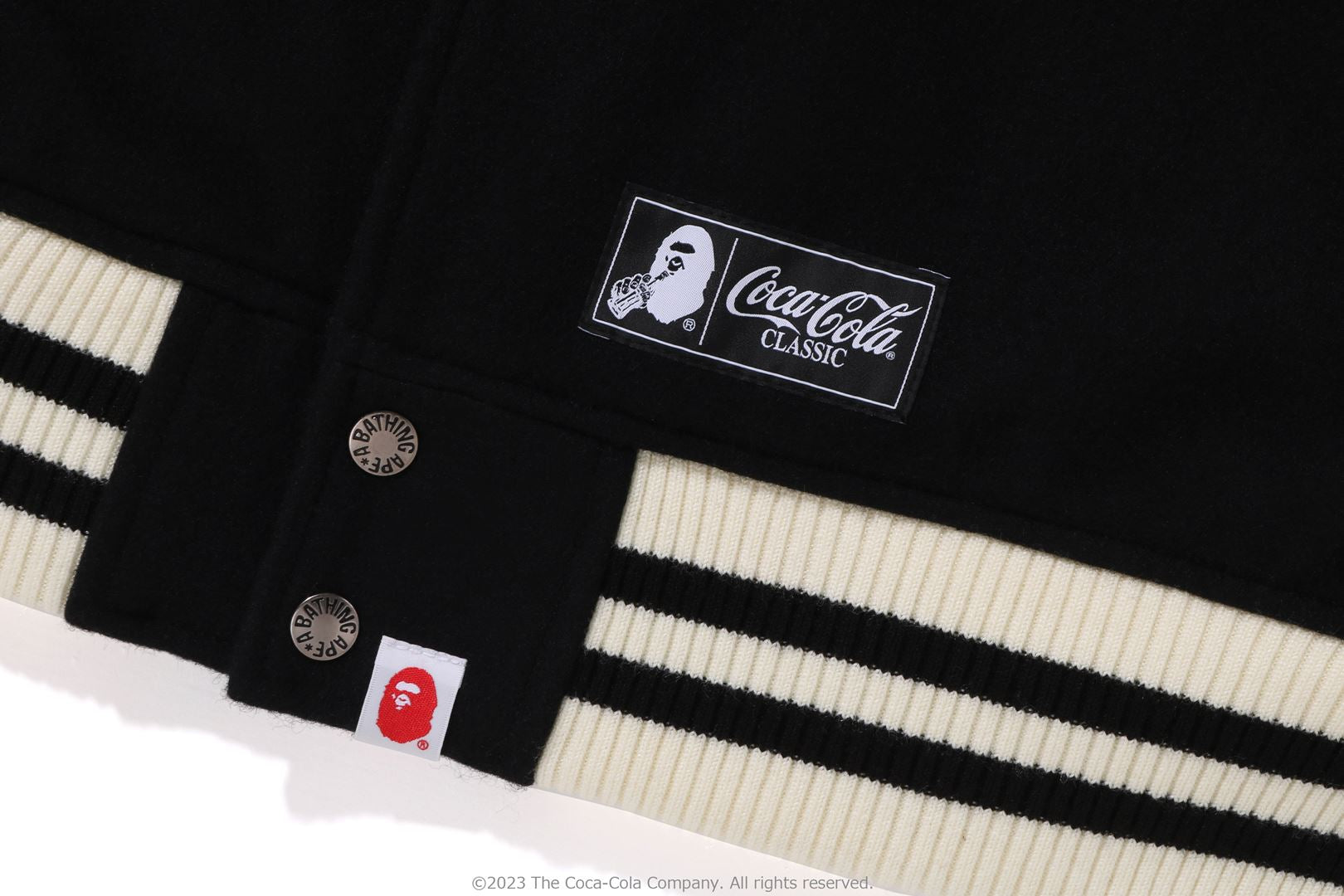 A varsity jacket with piece-dyed wool/nylon blend melton material on the body and cow leather on both arms. The lining is quilted with a COLOR CAMO pattern and padded. APE HEAD Sagara patch with Coca-Cola on the left chest, Coca-Cola logo directly embroidered on the right chest, A BATHING APE logo Sagara patch on the left arm, Coca-Cola Polar Bear embroidered emblem patch on the right arm, on the back A design with the Coca-Cola logo Sagara patch and multiple letter graphics directly embroidered. An X Coca-Cola woven name is stamped on the lower center of the body, and a piss name is tucked in the center of the hem. Slash pockets are placed on both sides. A silhouette with a relaxed fit. Available in 2 colors and 5 sizes. A collaboration model with Coca-Cola. ?2023 The Coca-Cola Company. All Rights Reserved.
