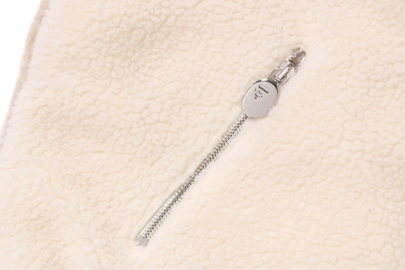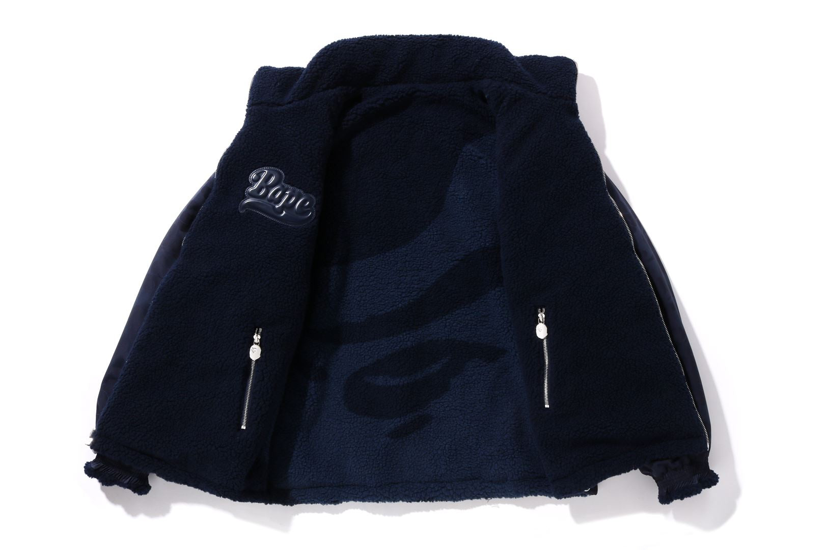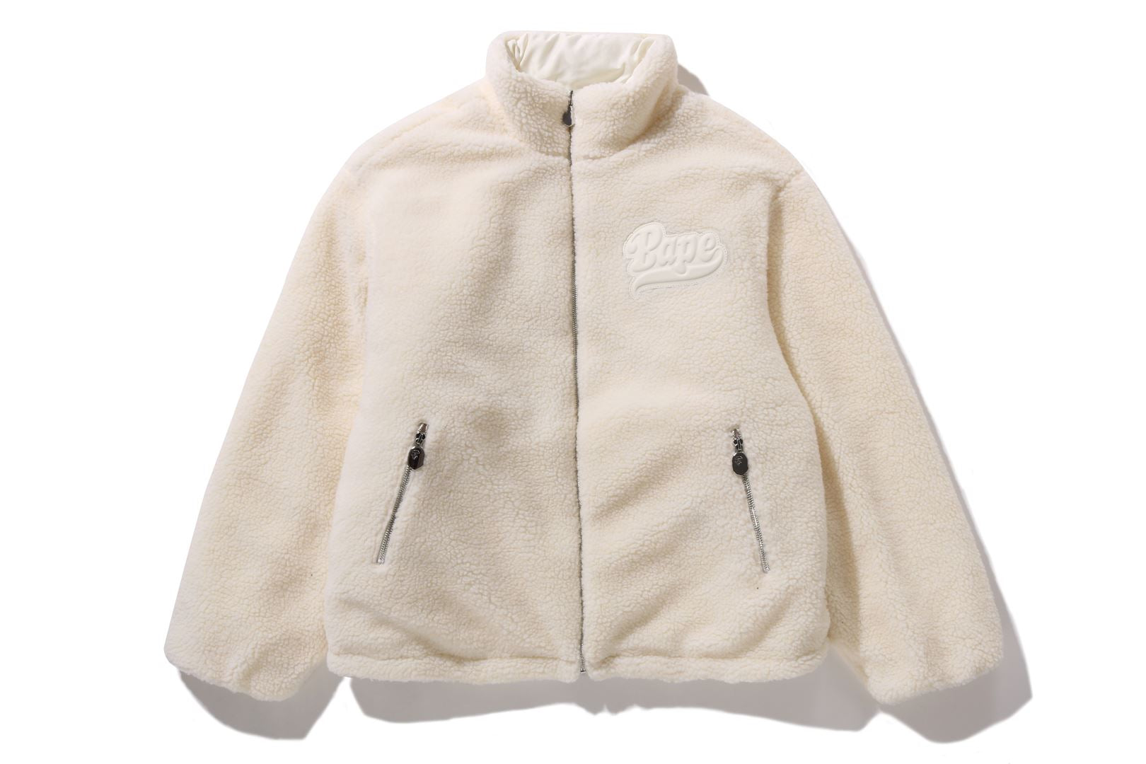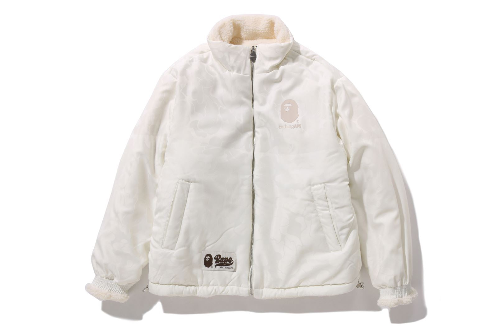 Reversible zip-up fleece jacket made of polyester boa material. The A side is designed with a cursive logo patch on the left chest and APE FACE expressed in jacquard on the back. APE HEAD charms are used on the front zipper and zipper heads on both side pockets. The B side is designed with an all-over APE CAMO pattern print. APE HEAD is directly embroidered on the left chest, and the woven name is embossed at the bottom center of the body. A silhouette with a relaxed fit. Available in 2 colors and 5 sizes.