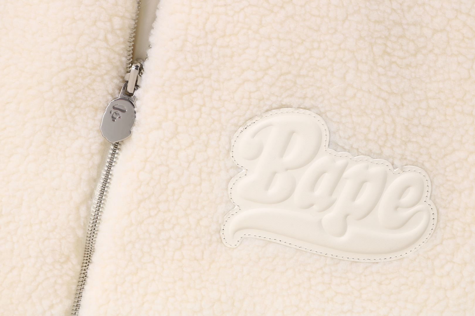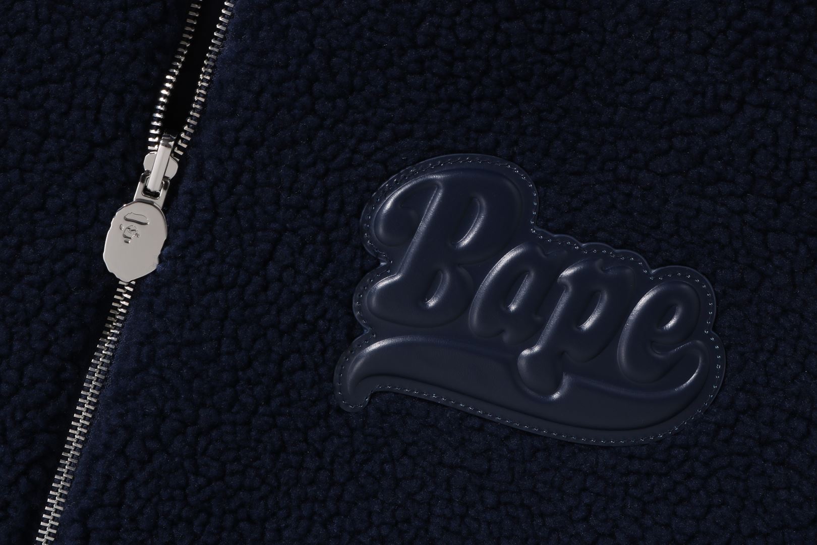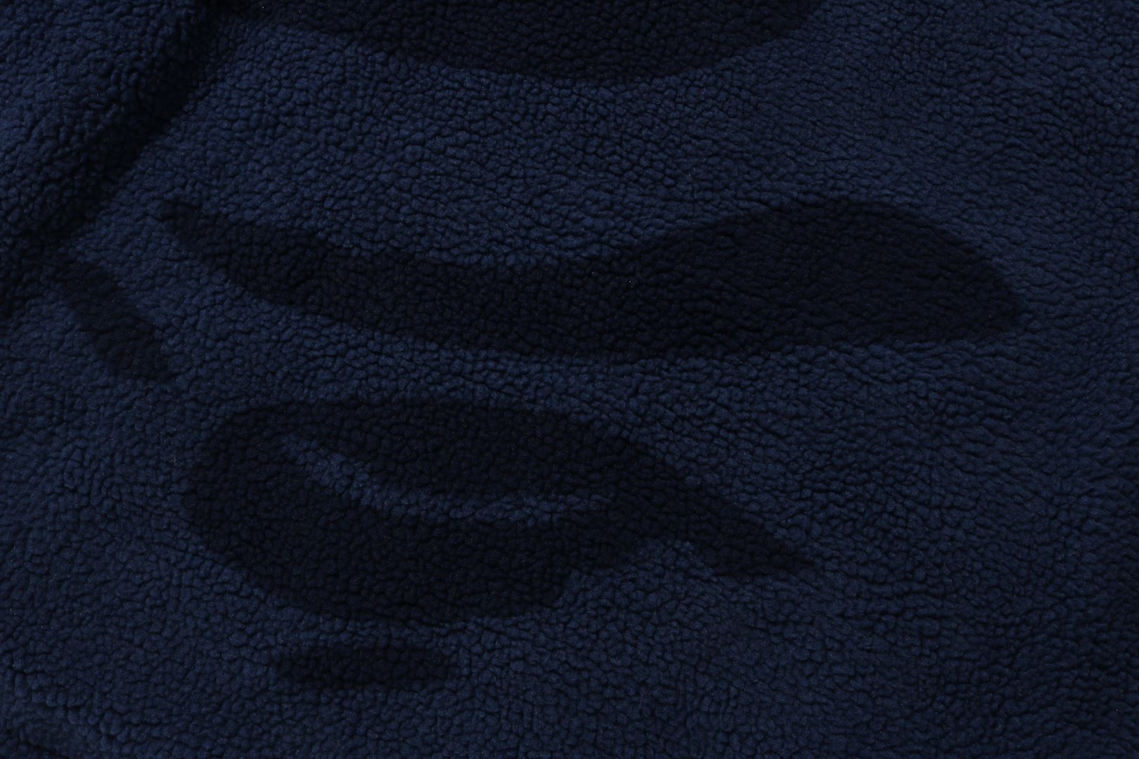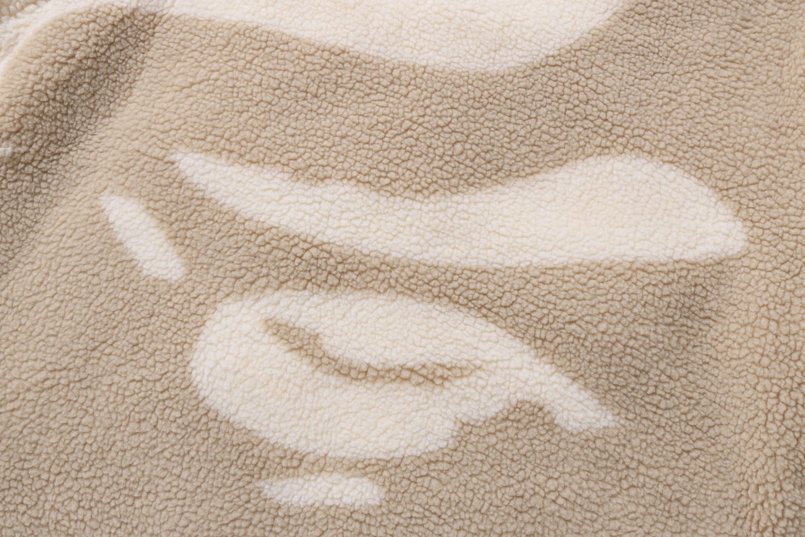 Reversible zip-up fleece jacket made of polyester boa material. The A side is designed with a cursive logo patch on the left chest and APE FACE expressed in jacquard on the back. APE HEAD charms are used on the front zipper and zipper heads on both side pockets. The B side is designed with an all-over APE CAMO pattern print. APE HEAD is directly embroidered on the left chest, and the woven name is embossed at the bottom center of the body. A silhouette with a relaxed fit. Available in 2 colors and 5 sizes.