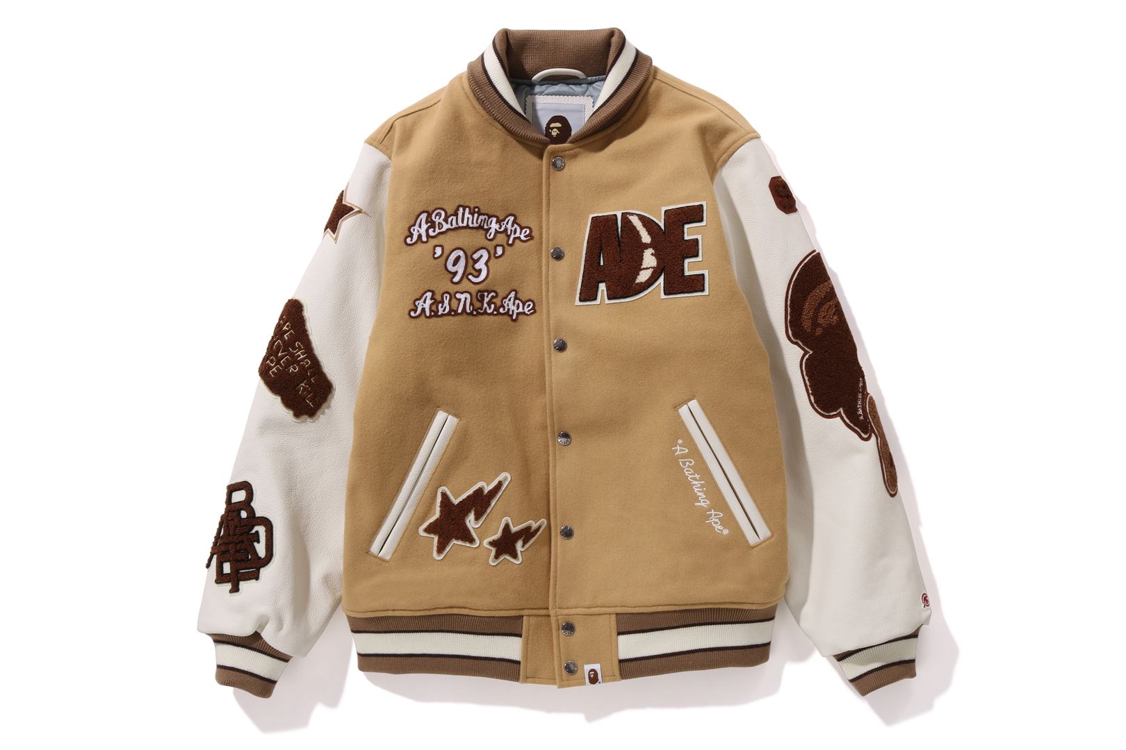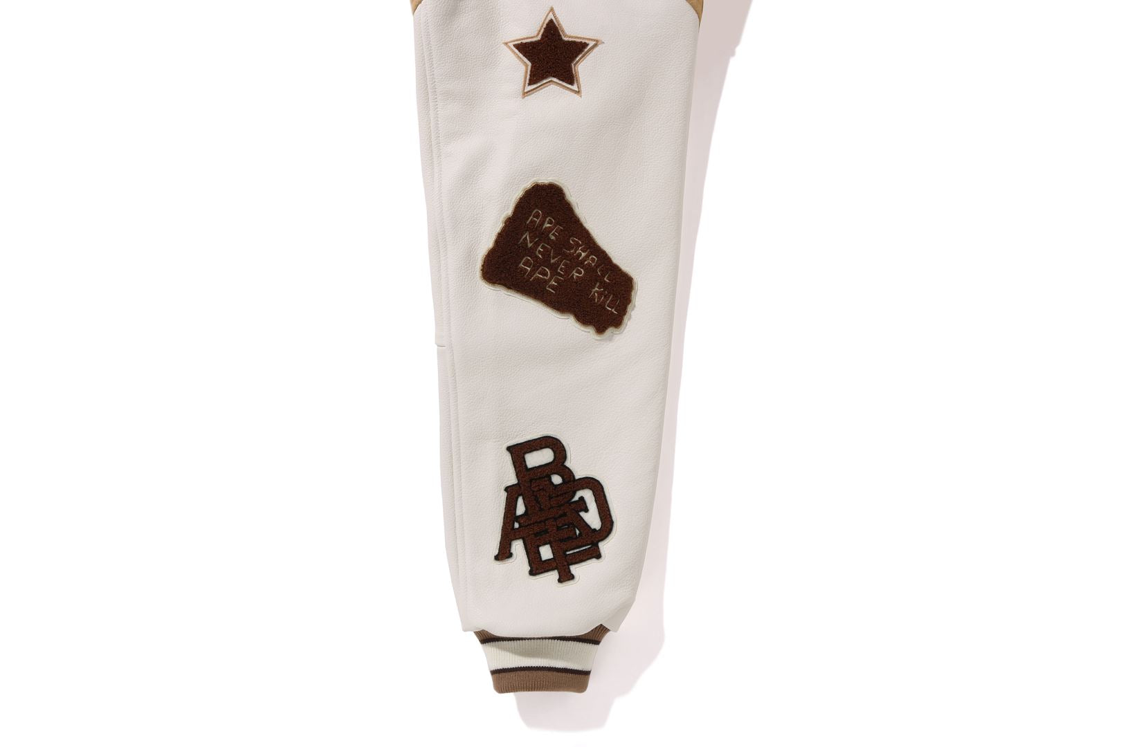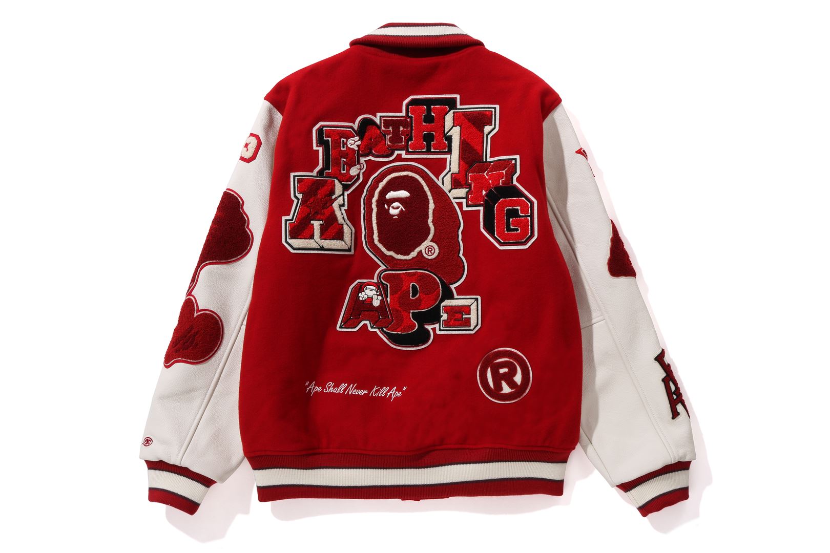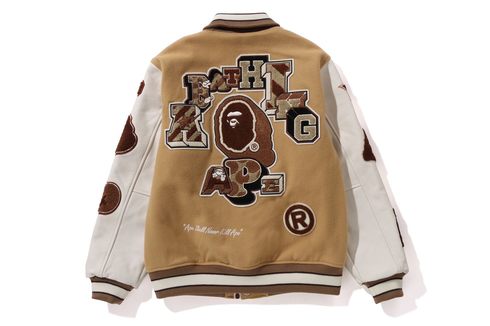 Varsity jacket made of wool/nylon blend melton material. Both arms are made of cow leather with numerous patches. APE logo on the left chest , Sagara patch on the right abdomen, chain stitch brand logo and numbering on the right chest, A BATHING APE logo and APE HEAD Sagara on the back A design that expresses the embroidered letter graphic of the emblem, APE SHALL NEVER KILL APE. There are slash pockets on both sides with leather trim on the pocket edges, and striped knit ribs on the collar, sleeves, and hem. A silhouette with ample width. Available in 2 colors and 5 sizes.