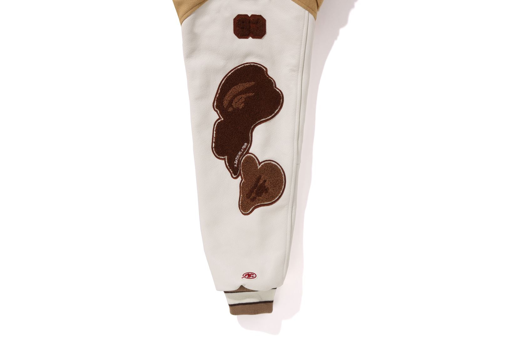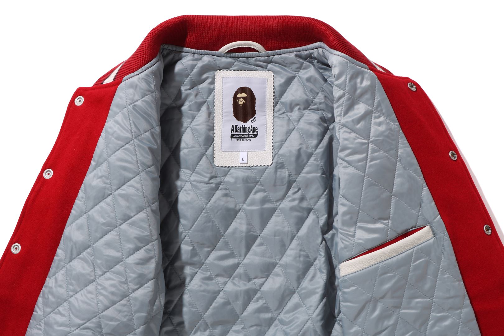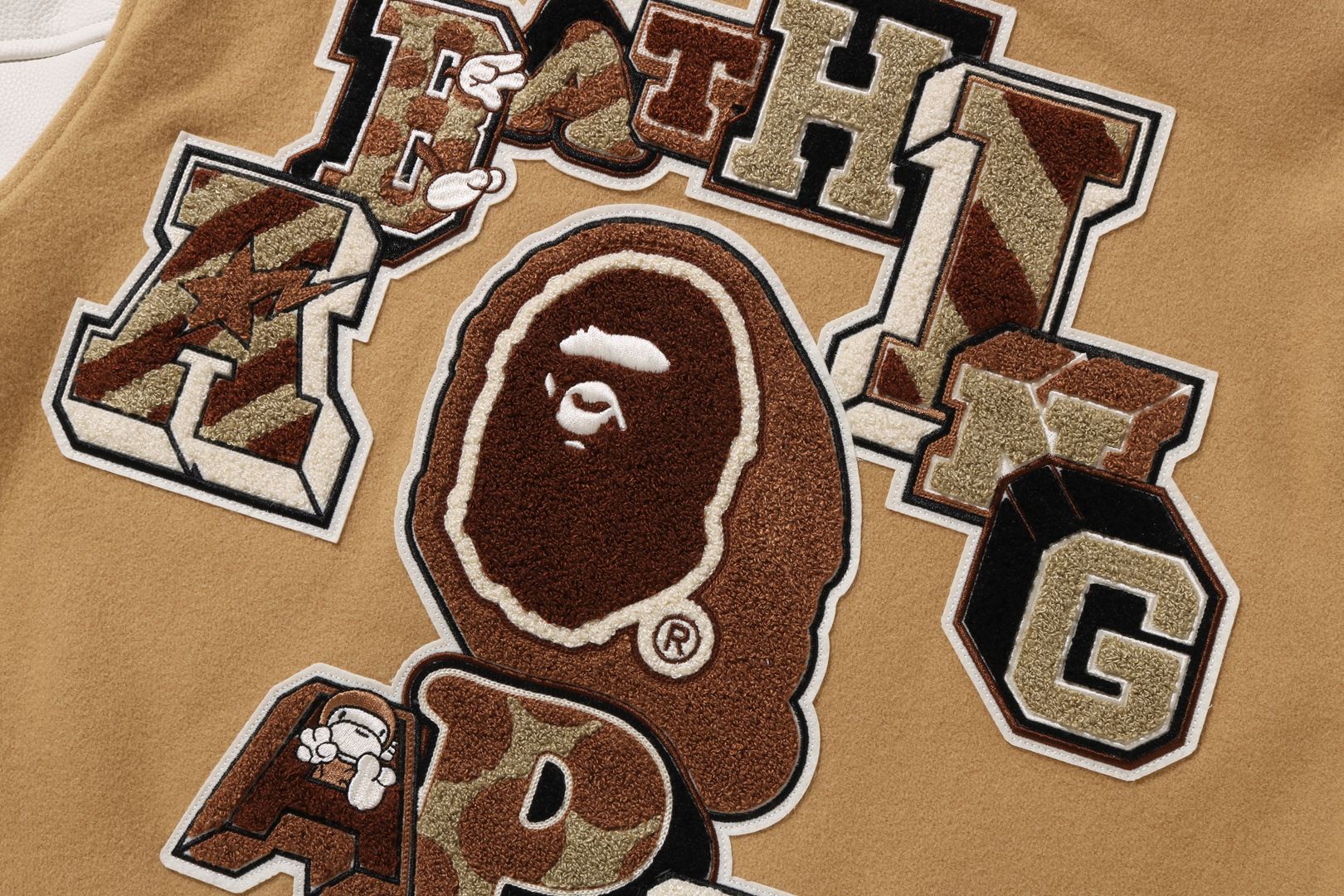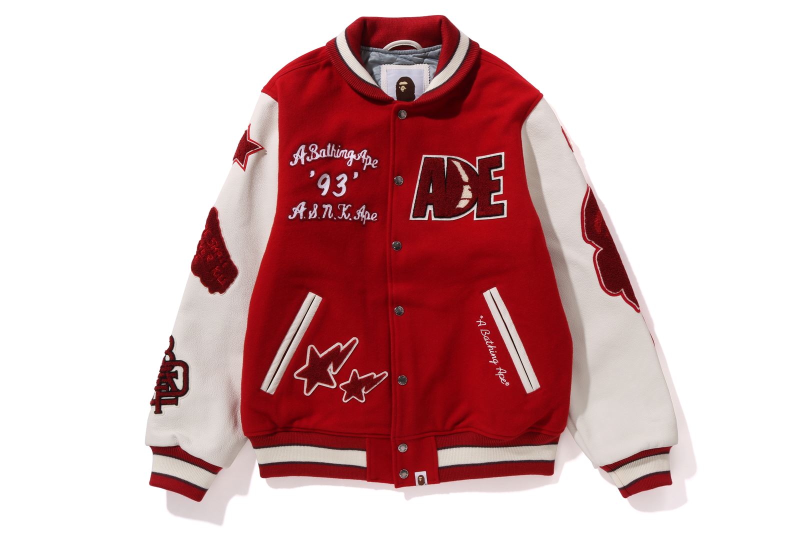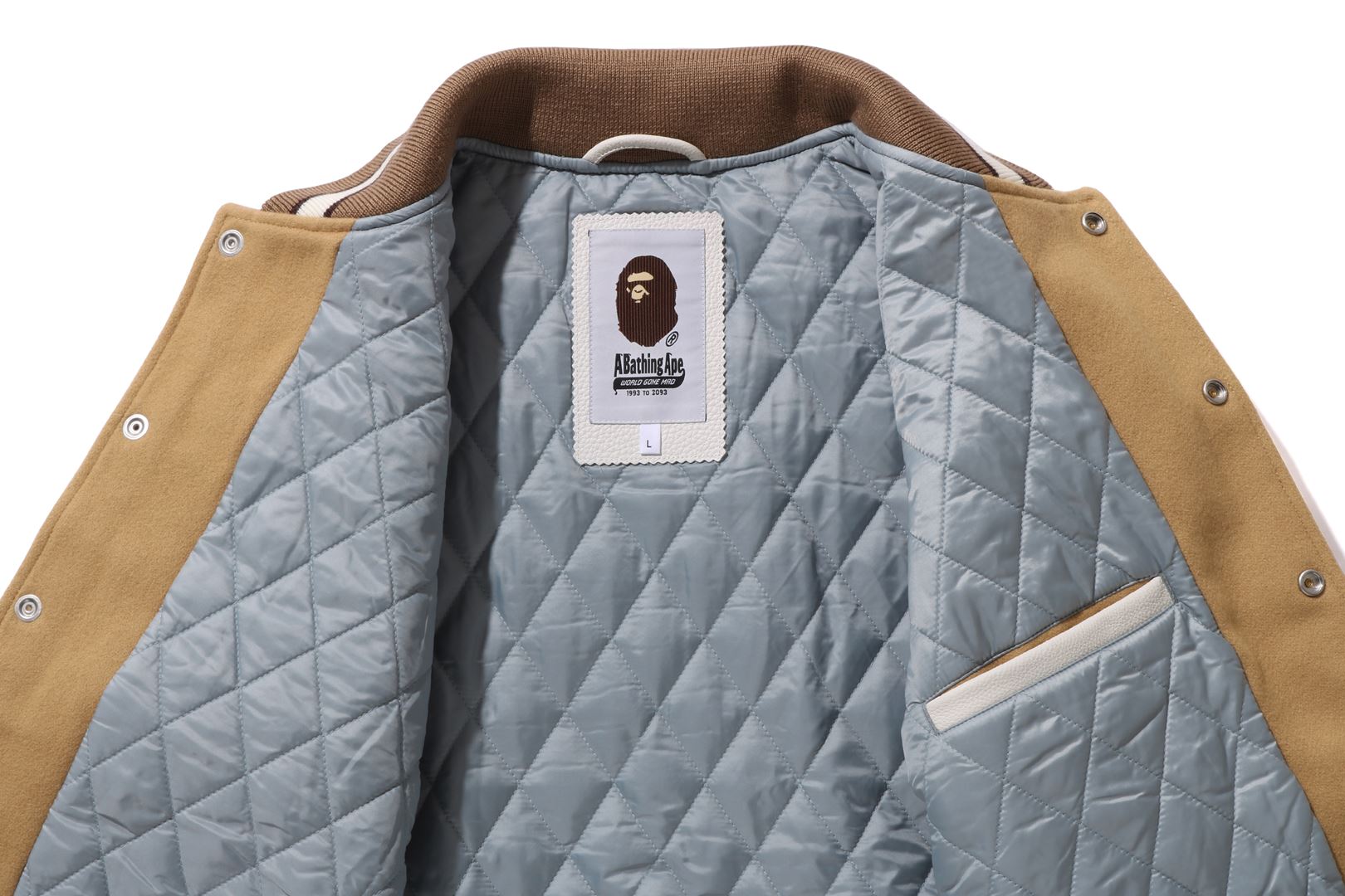 Varsity jacket made of wool/nylon blend melton material. Both arms are made of cow leather with numerous patches. APE logo on the left chest , Sagara patch on the right abdomen, chain stitch brand logo and numbering on the right chest, A BATHING APE logo and APE HEAD Sagara on the back A design that expresses the embroidered letter graphic of the emblem, APE SHALL NEVER KILL APE. There are slash pockets on both sides with leather trim on the pocket edges, and striped knit ribs on the collar, sleeves, and hem. A silhouette with ample width. Available in 2 colors and 5 sizes.