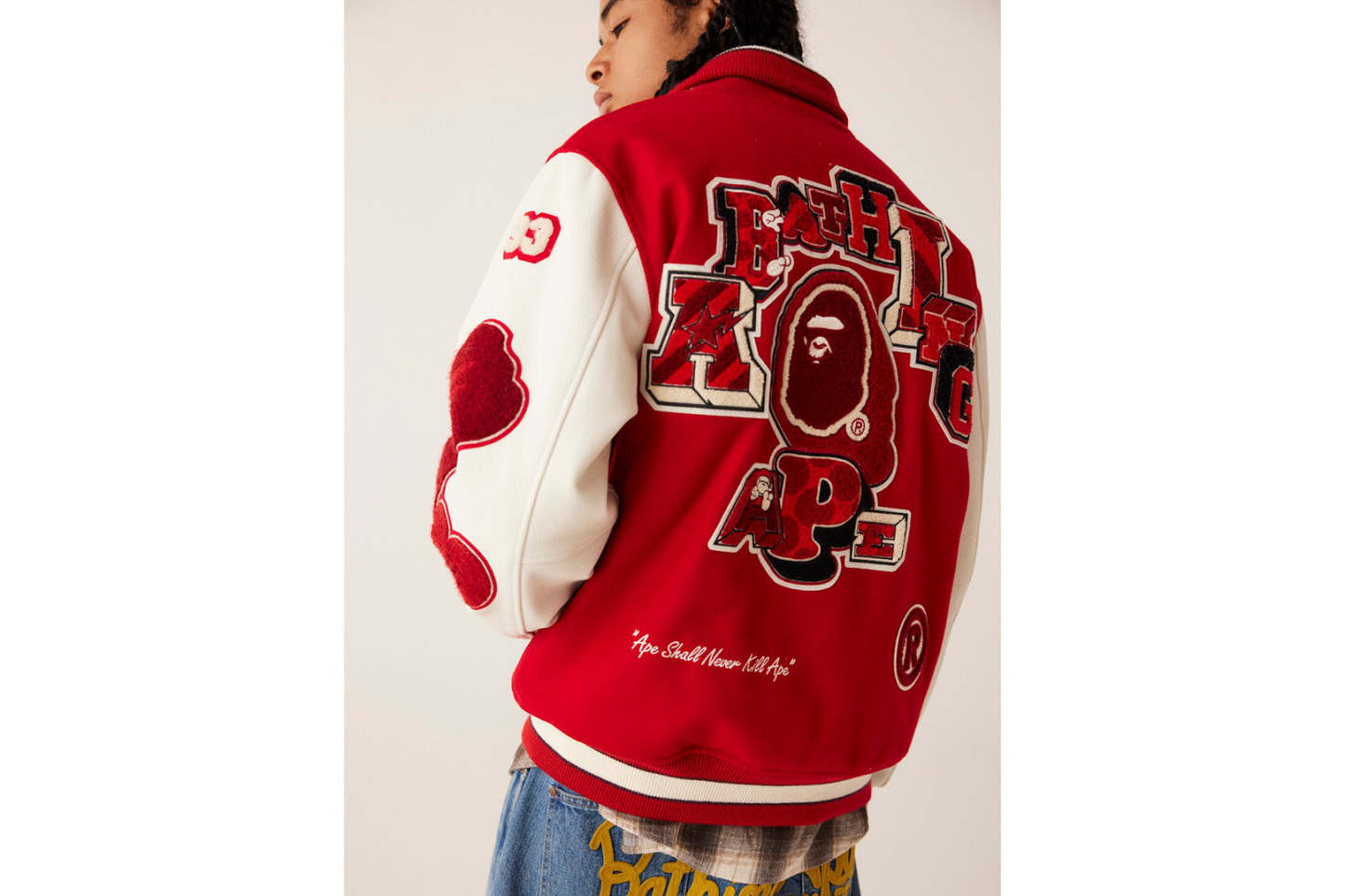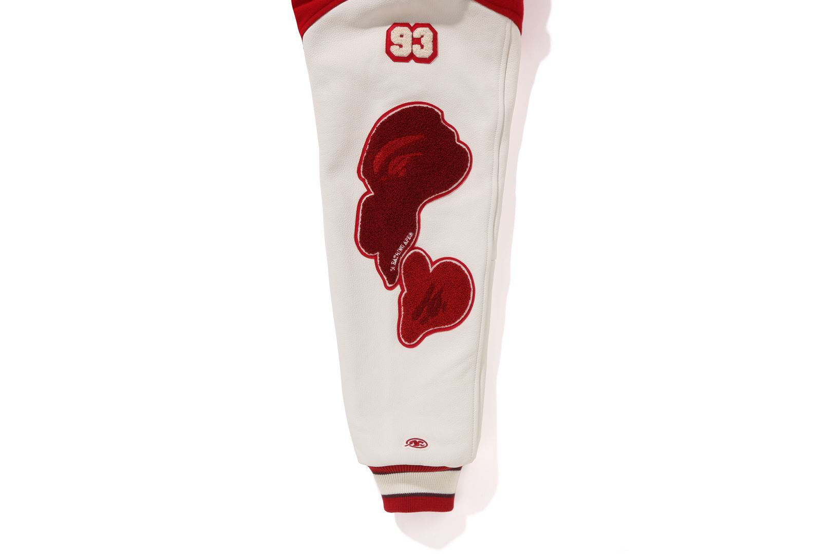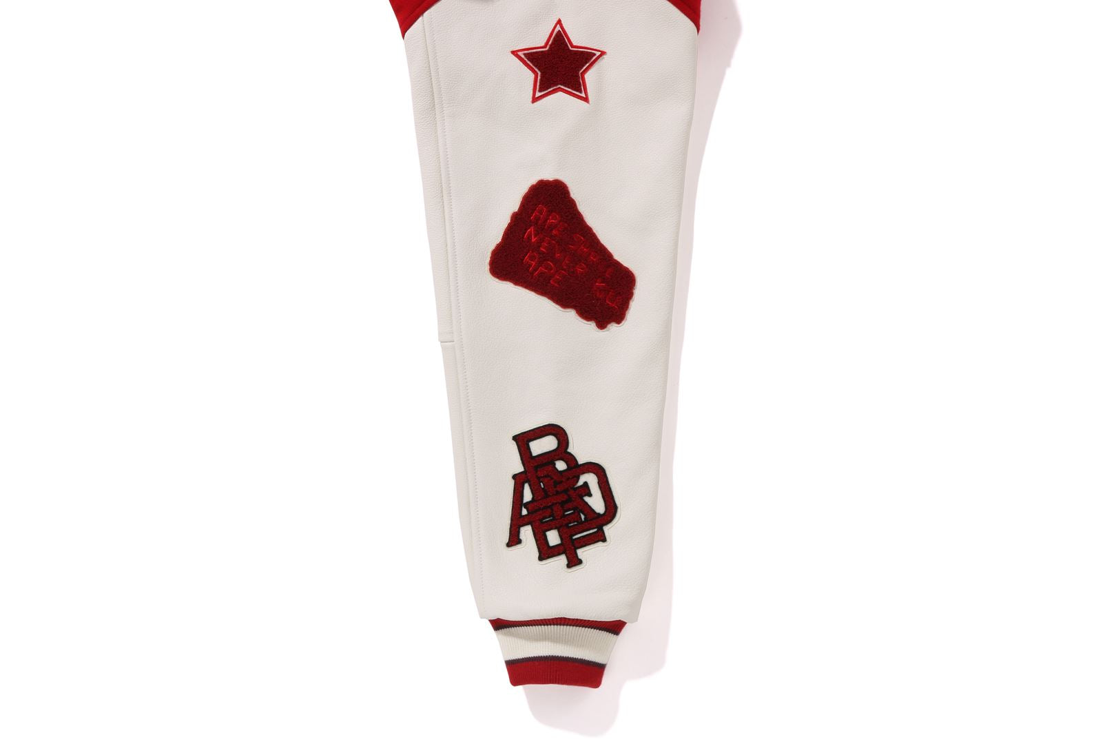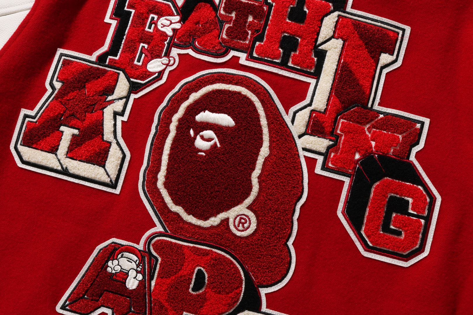 Varsity jacket made of wool/nylon blend melton material. Both arms are made of cow leather with numerous patches. APE logo on the left chest , Sagara patch on the right abdomen, chain stitch brand logo and numbering on the right chest, A BATHING APE logo and APE HEAD Sagara on the back A design that expresses the embroidered letter graphic of the emblem, APE SHALL NEVER KILL APE. There are slash pockets on both sides with leather trim on the pocket edges, and striped knit ribs on the collar, sleeves, and hem. A silhouette with ample width. Available in 2 colors and 5 sizes.