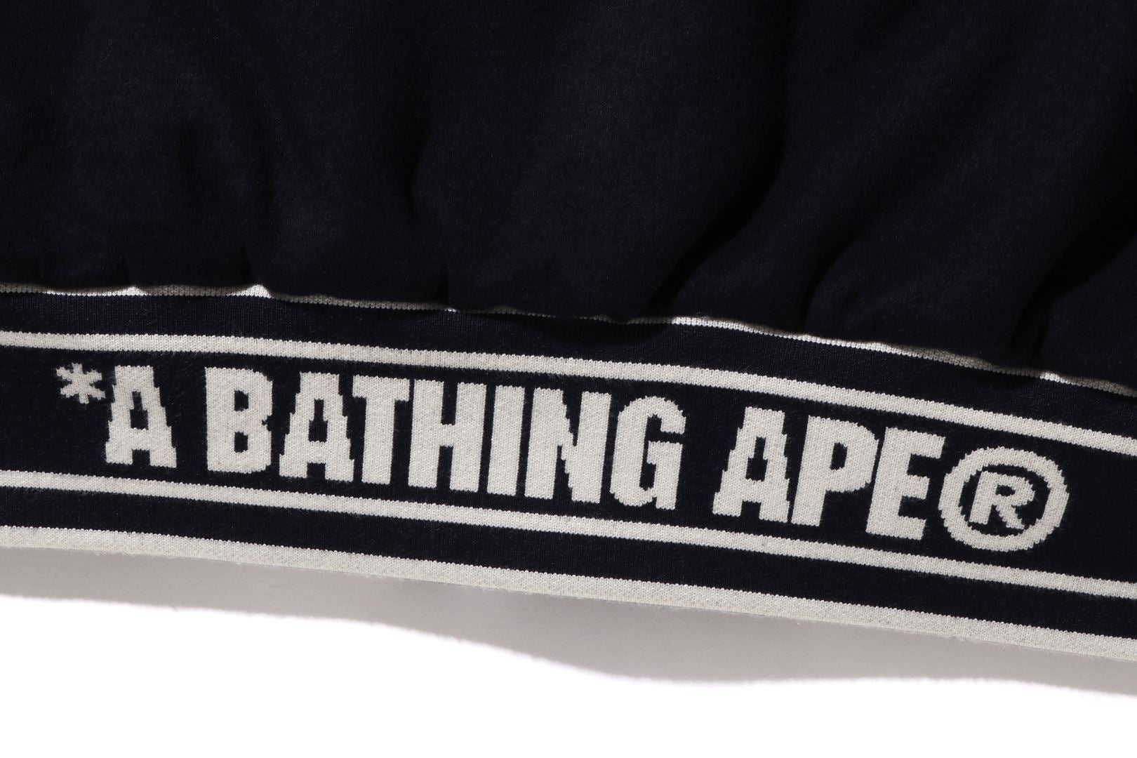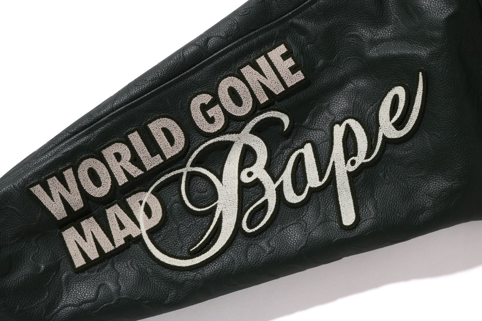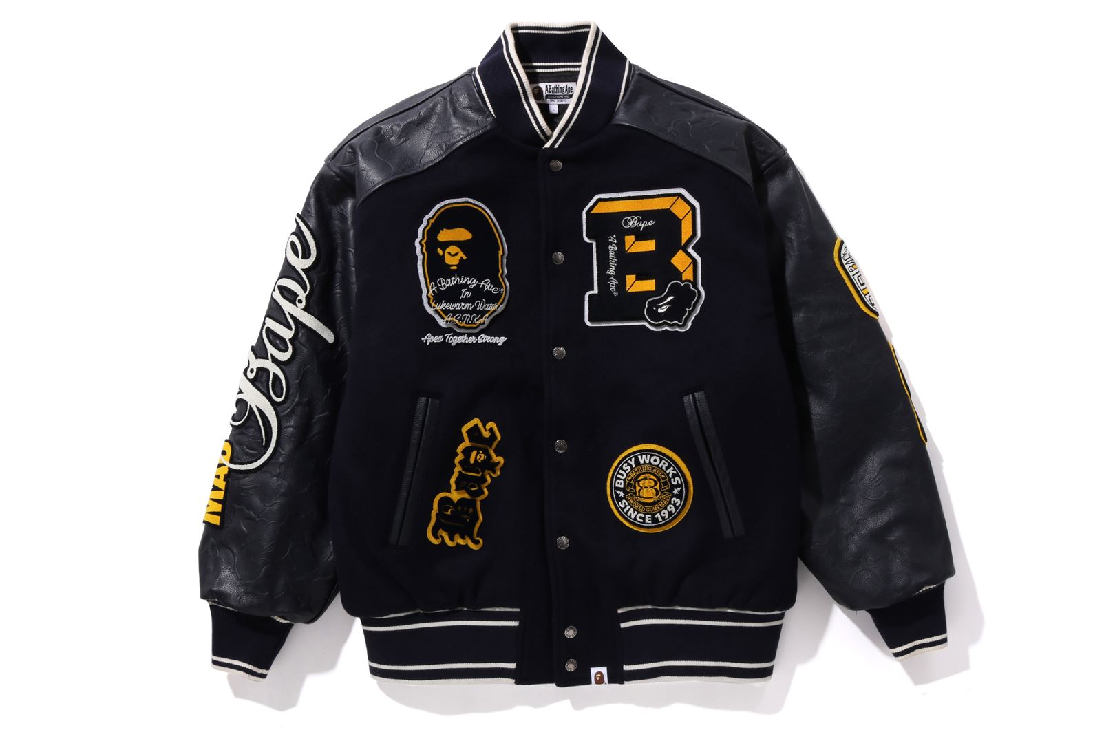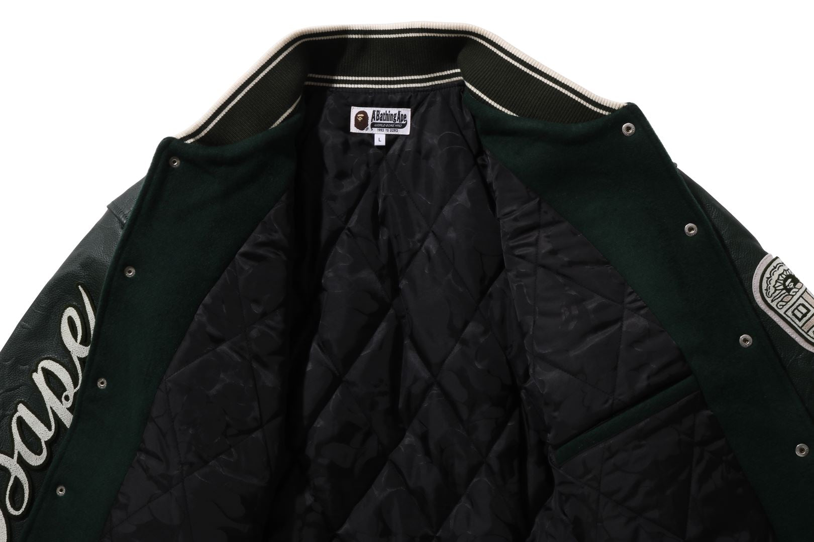 A varsity jacket with a wool/polyester/acrylic/nylon blend melton material on the body, cow leather on both arms, and polyester lining. B logo on the left chest, APE HEAD Sagara patch on the right chest, a circle patch on the lower right of the front, and an emblem-shaped patch on the left sleeve. The BAthtPE logo is directly embroidered on the lower left of the front, and the WORLD GONE MAD/BAthtPE logo is embroidered on the right arm. The APE HEAD felt patch is placed in the center of the back, and the arched brand logo and WGM logo are directly embroidered around the patch. The brand name is expressed in jacquard on the hem rib. A piss name is inserted in the center of the hem. A relaxed silhouette, available in 2 colors and 5 sizes.