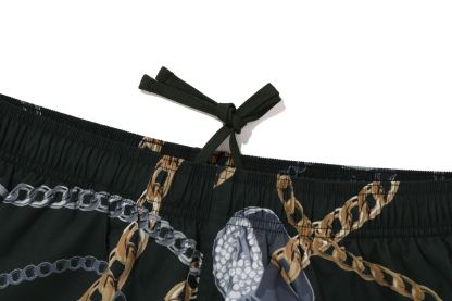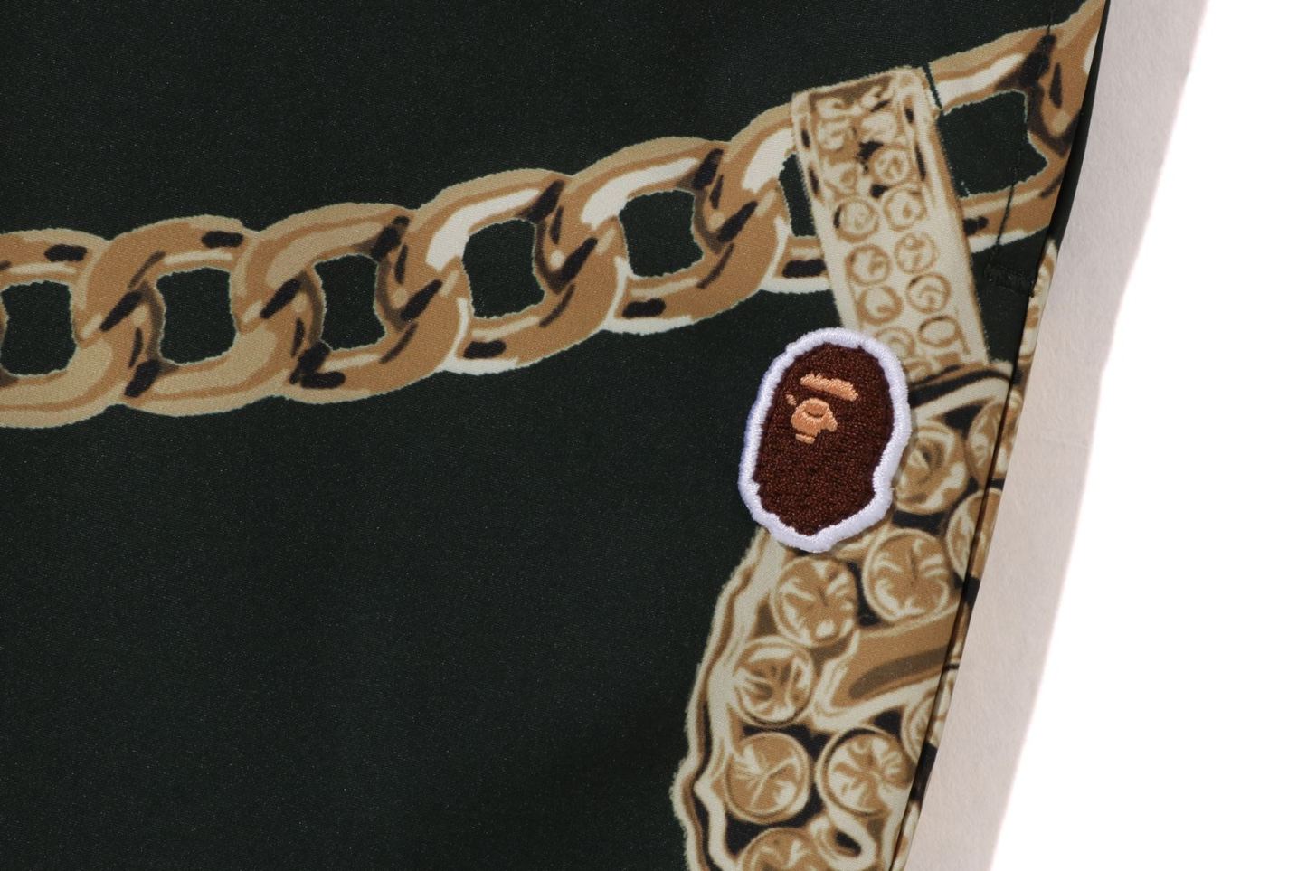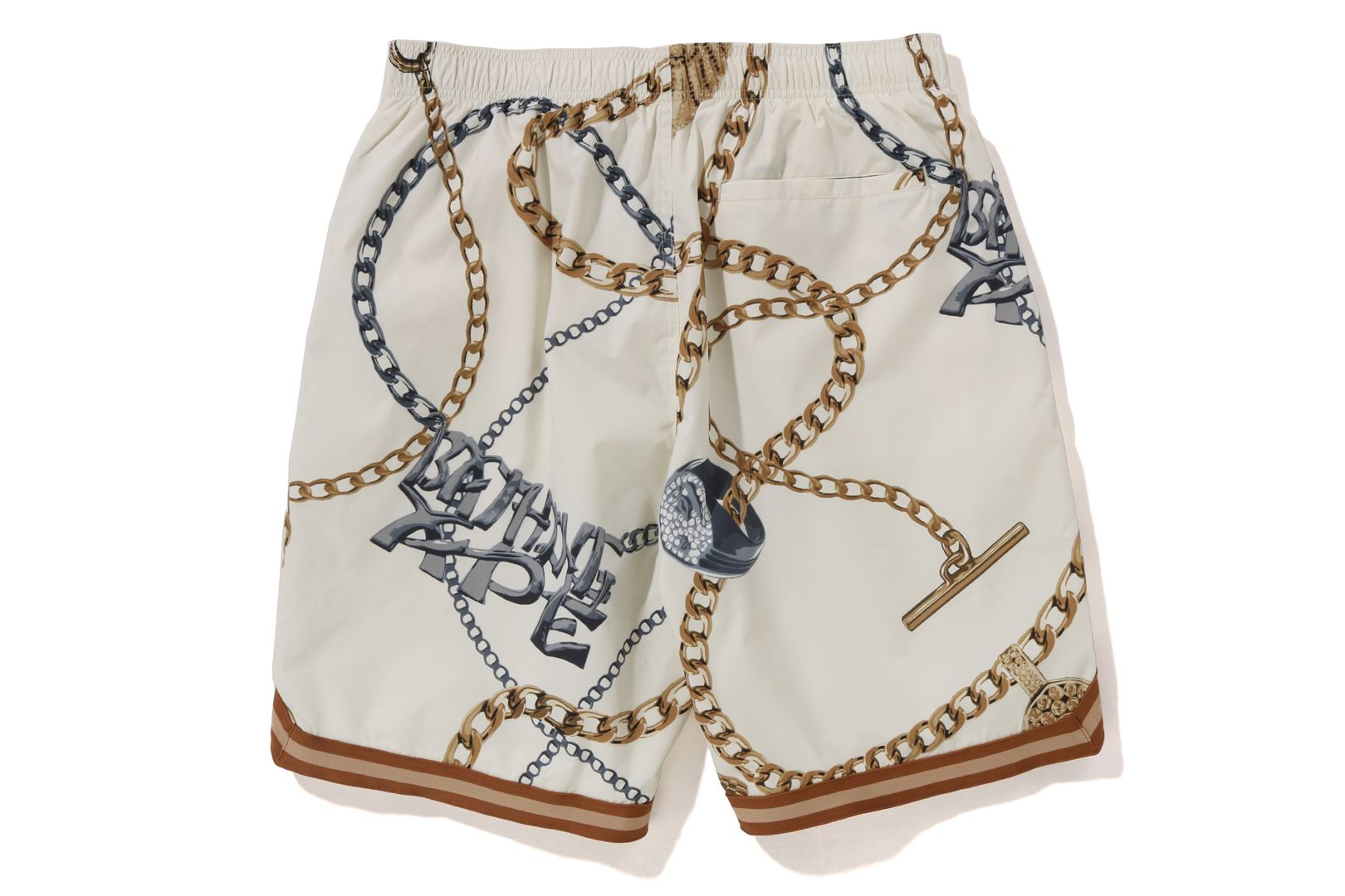 Shorts made of glossy polytaffeta material. A design expressed with JEWELS all-over print on the entire body. An APE HEAD one-point patch is attached to the left thigh. Basketball shorts-