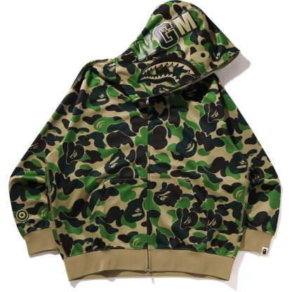 This ABC CAMO full-zip hoodie offers a soft, draping fabric that feels gentle on your skin. It includes a hood adorned with a detailed embroidered SHARK patch, adding a distinctive touch. Designed with a relaxed fit for comfortable wear.
